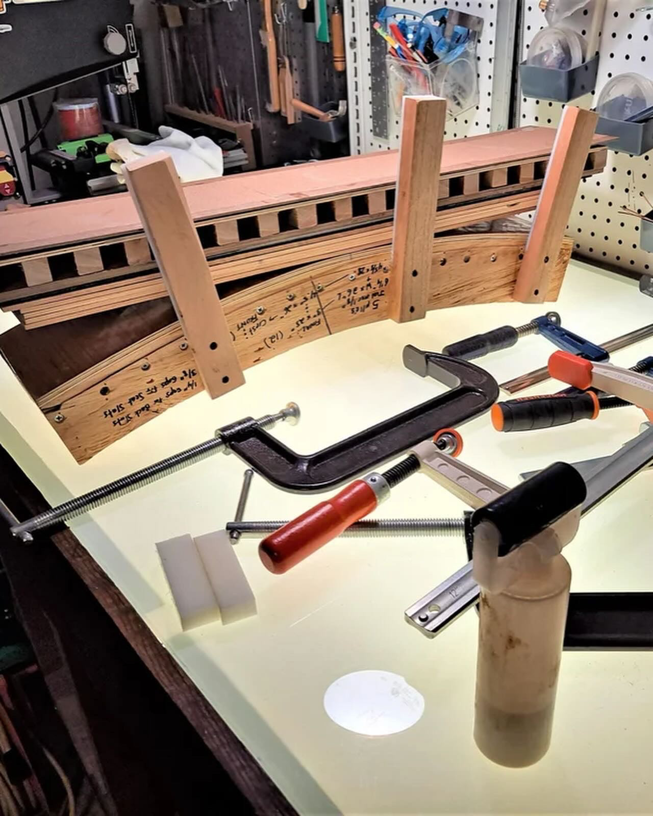 Constructed from five layers of 3mm laminated black walnut. The structure includes a hollowed shaft within the main beam to house an inlaid cable. Hung from the lamp is a hand wrapped wax-cord shade, offering a muted, even light. Inspired by the early works of Ray and Charles Eames, following the proportions of the Fibonacci spiral to guide its form. Awarded Best in Show at the 2023 T.E.A.M. conference.