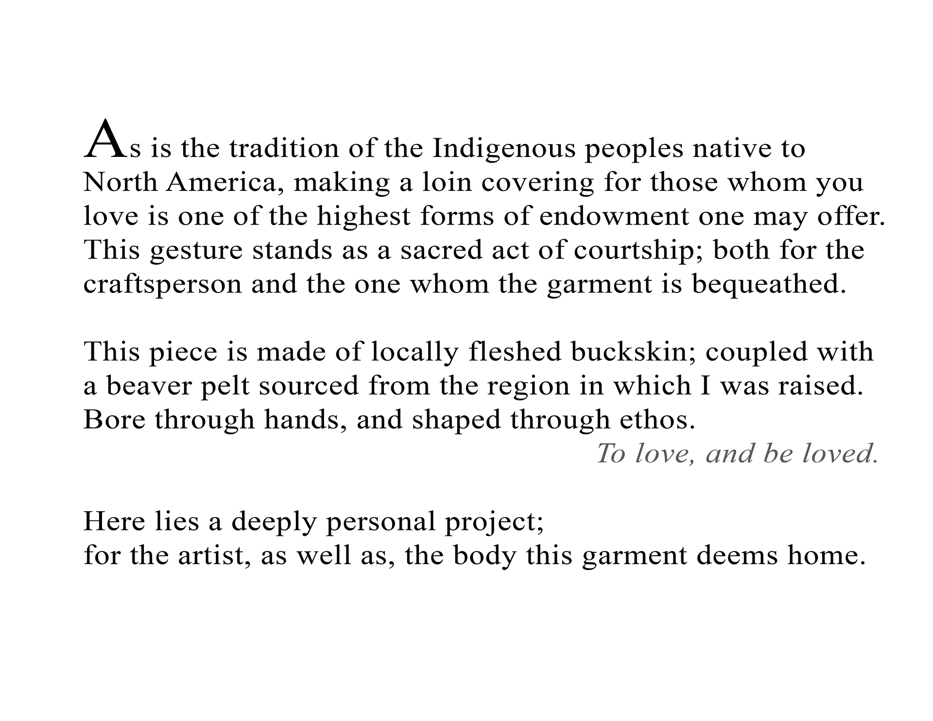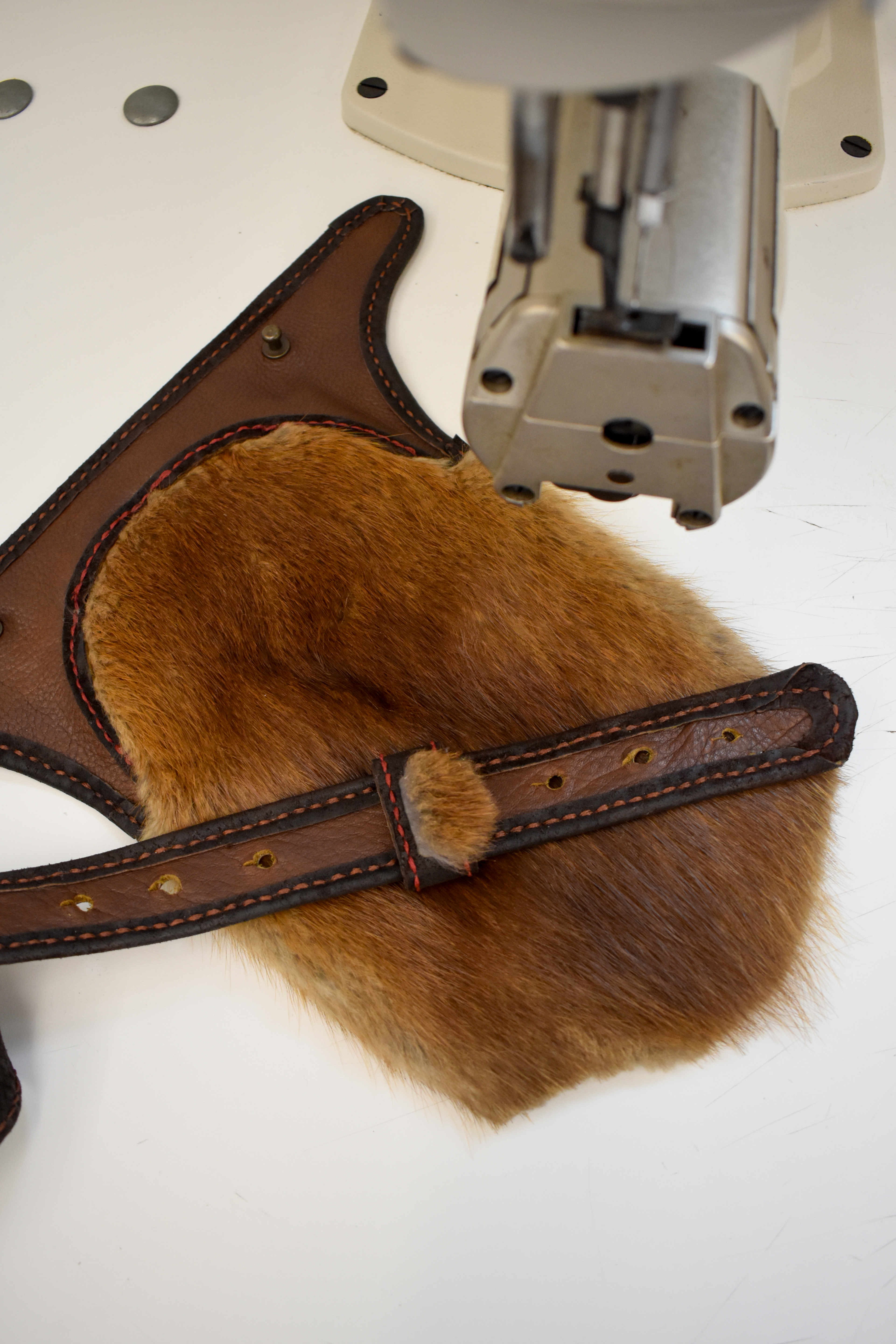 Crafted from locally fleshed buckskin, coupled with a beaver pelt sourced from the region in which I was raised. The pelt is full-grain, eight oz, brain-tanned, sourced from Eldorado Springs, Missouri. Entirely hand stitched using 2mm waxed Rhino thread.