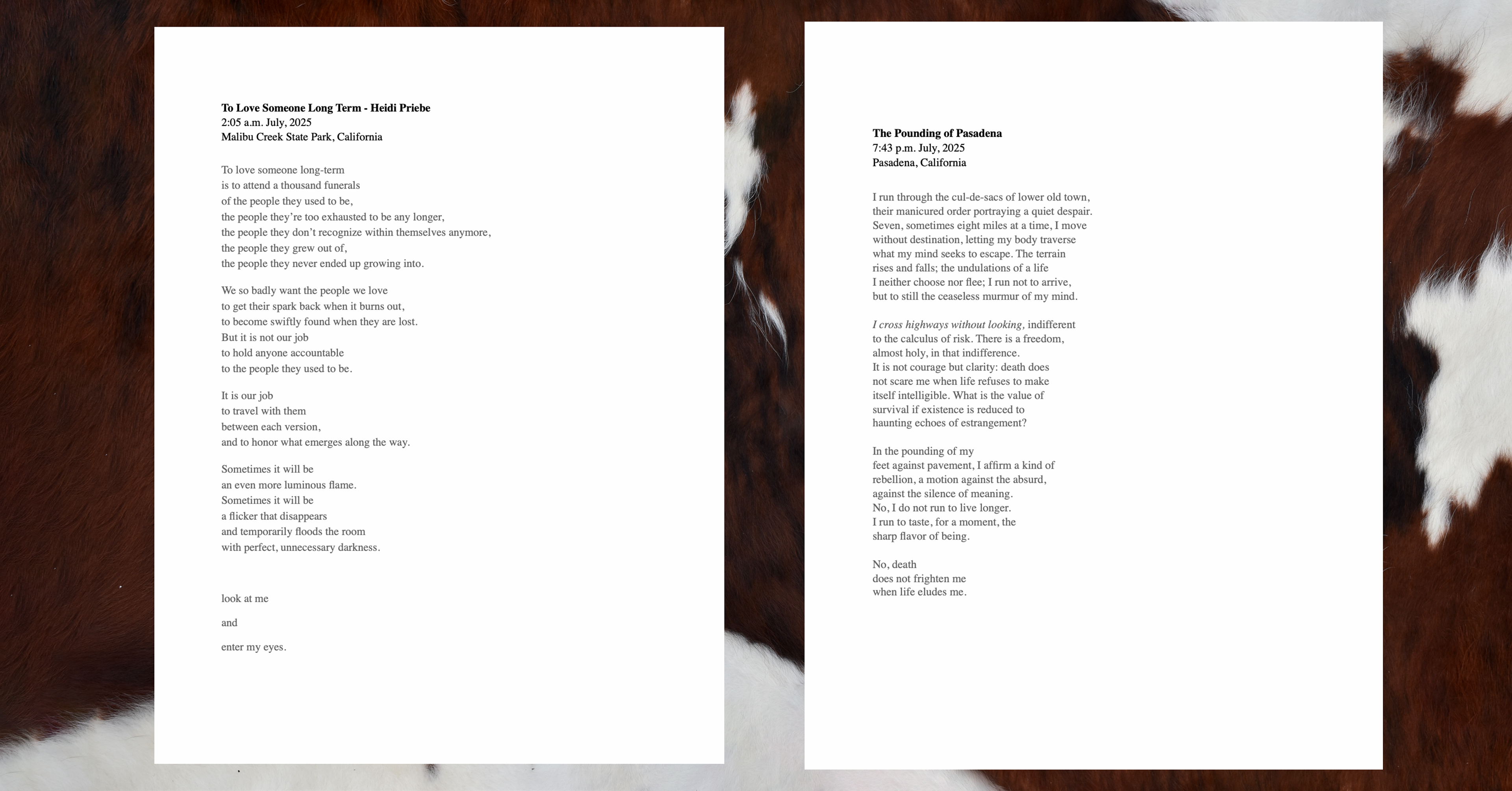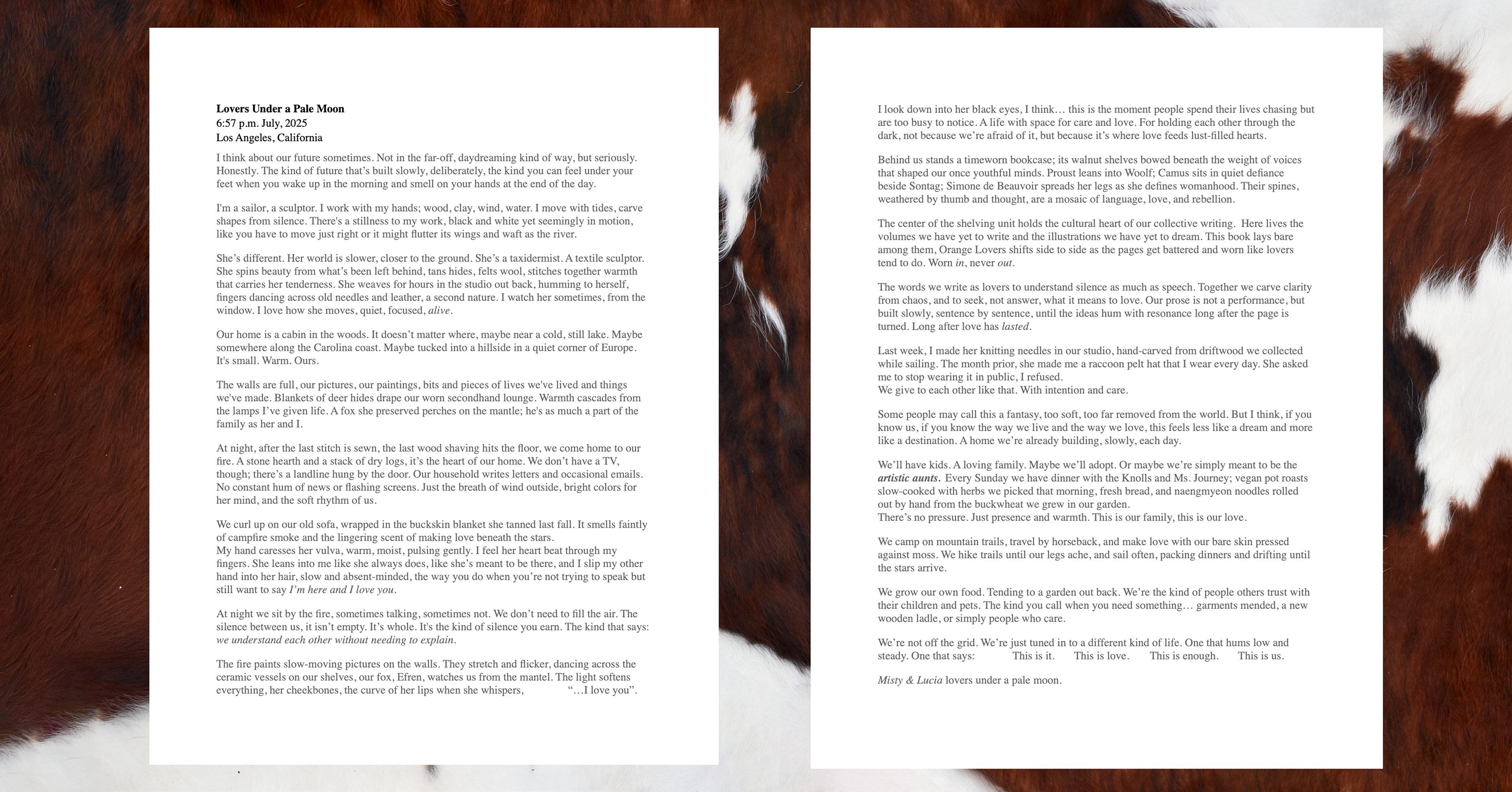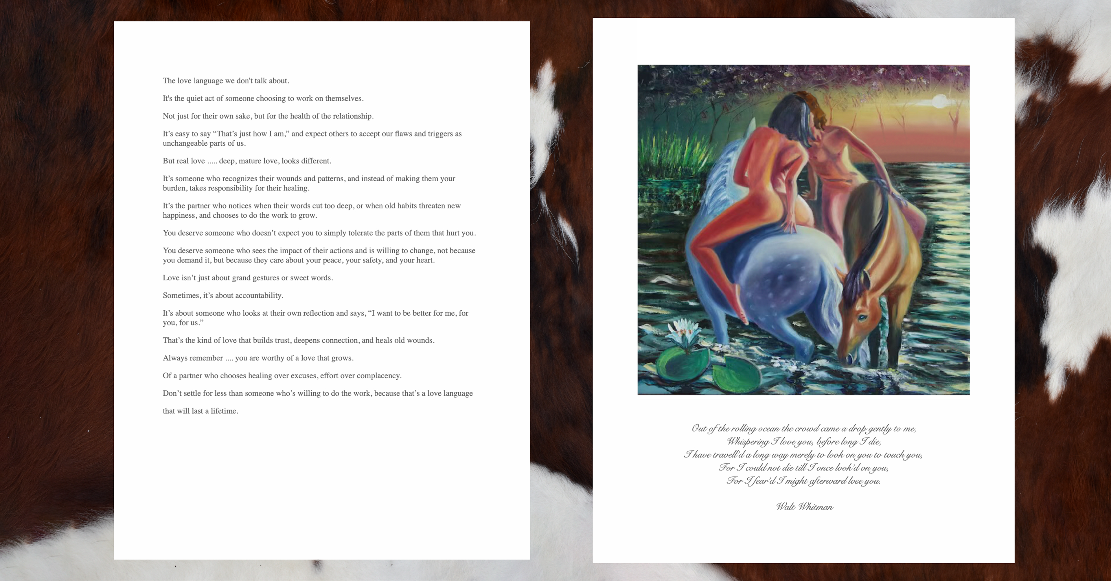 A dedication to love. An Exploration of devotion, intimacy, and emotional growth; through letters, poems, and portraits. Through the lens of personal reflection, I delve into vulnerability, adoration, and relational dynamics that surfaced in the wake of my separation with a loved partner. These pages examine our patterns of communication and the often-unspoken words that shaped us; both together and apart. They cover deep emotional maturation and crushing bouts of affection I experienced as I learned how to love through the hands of grief.
