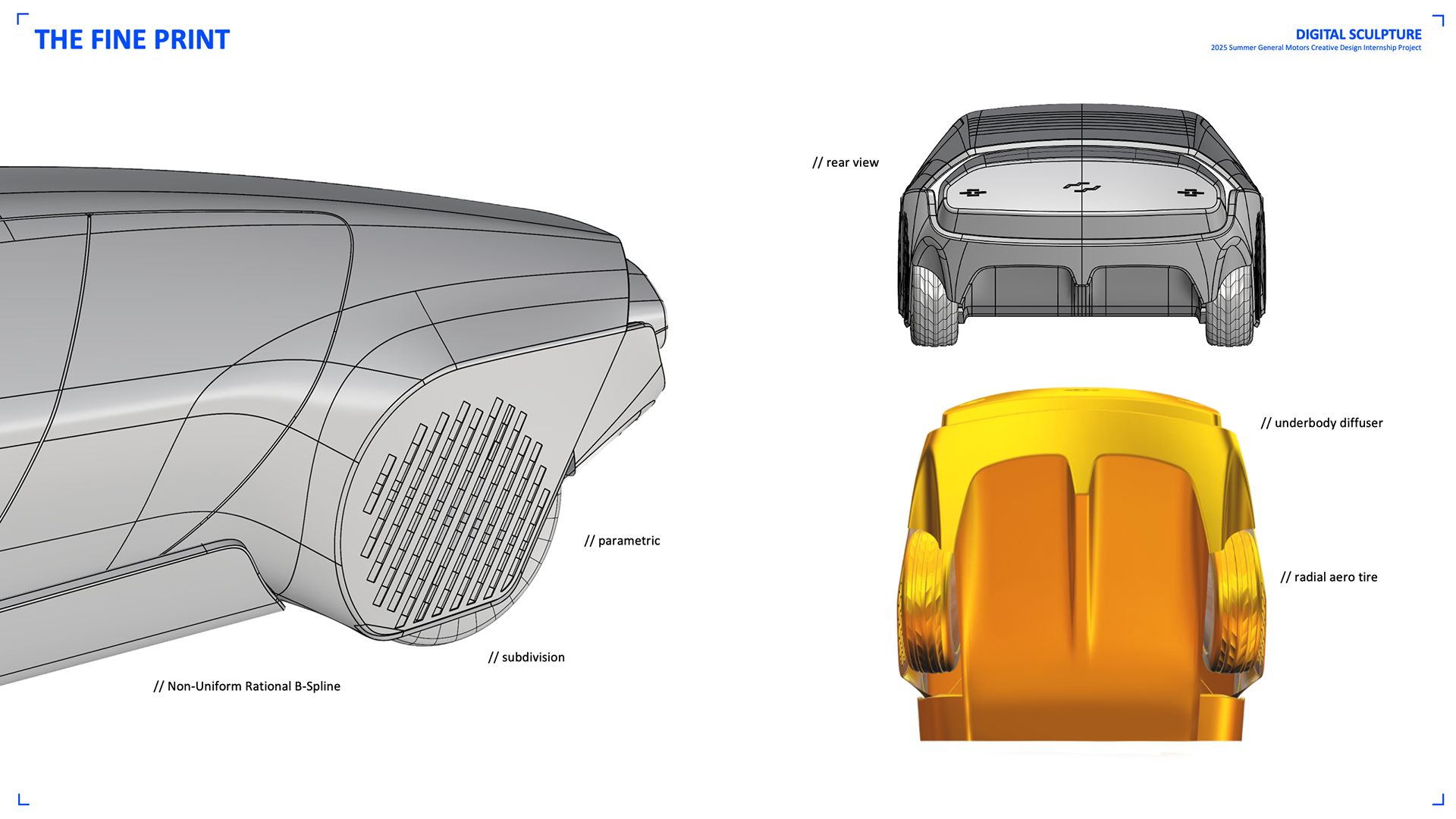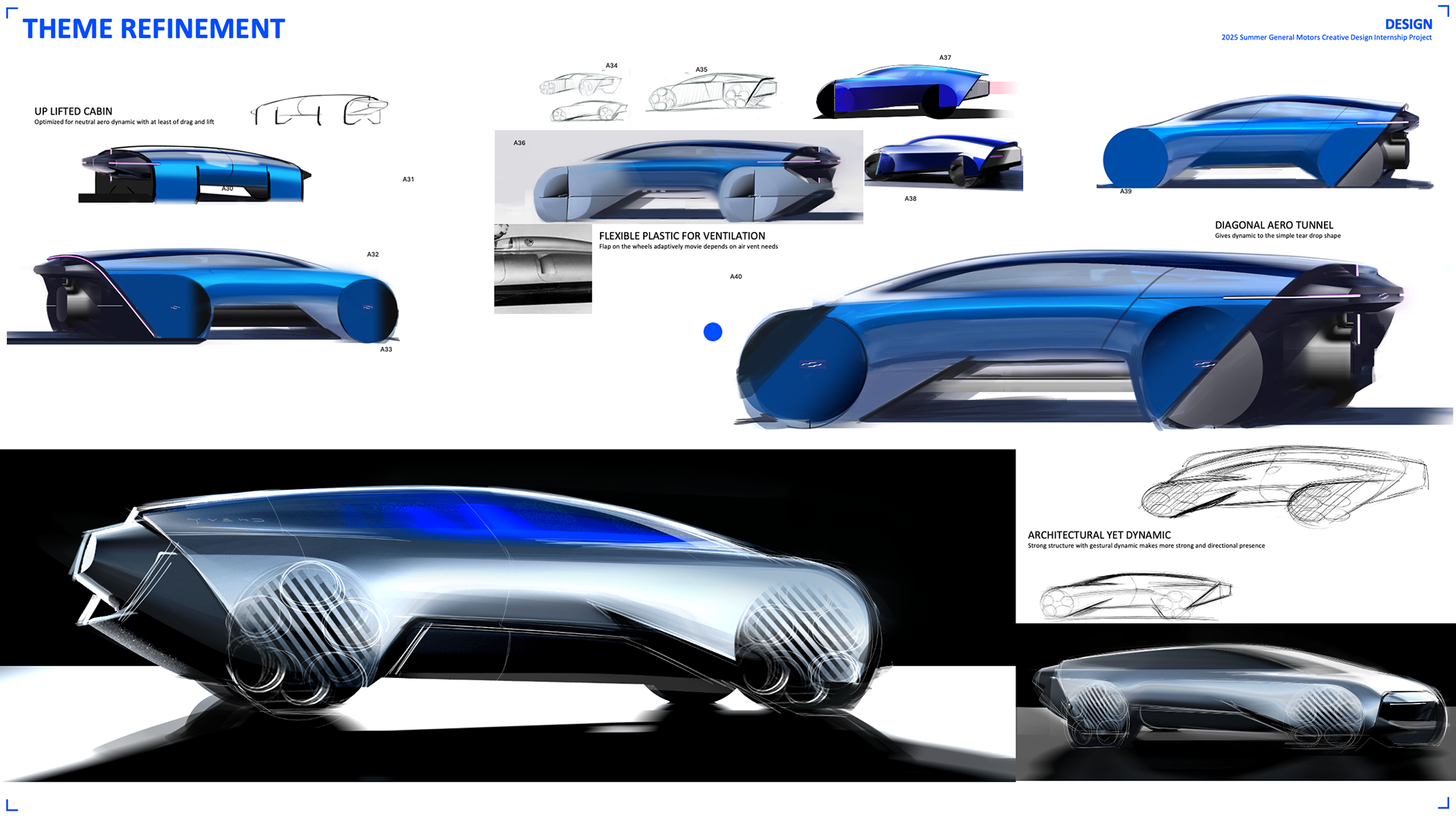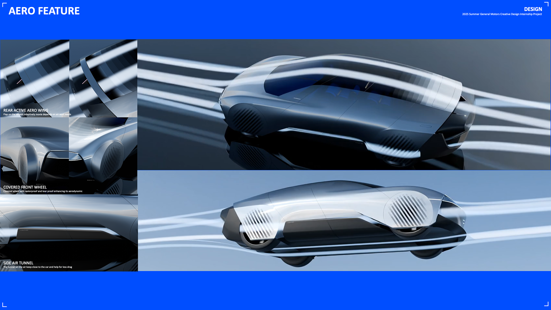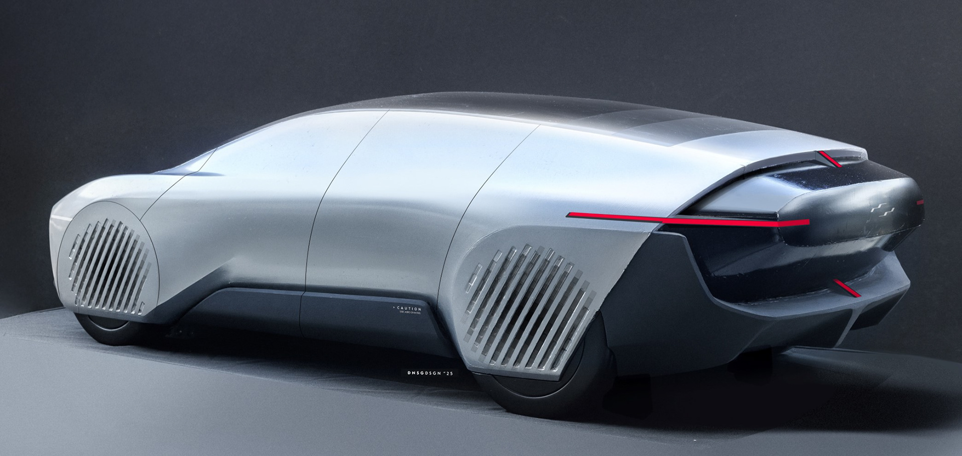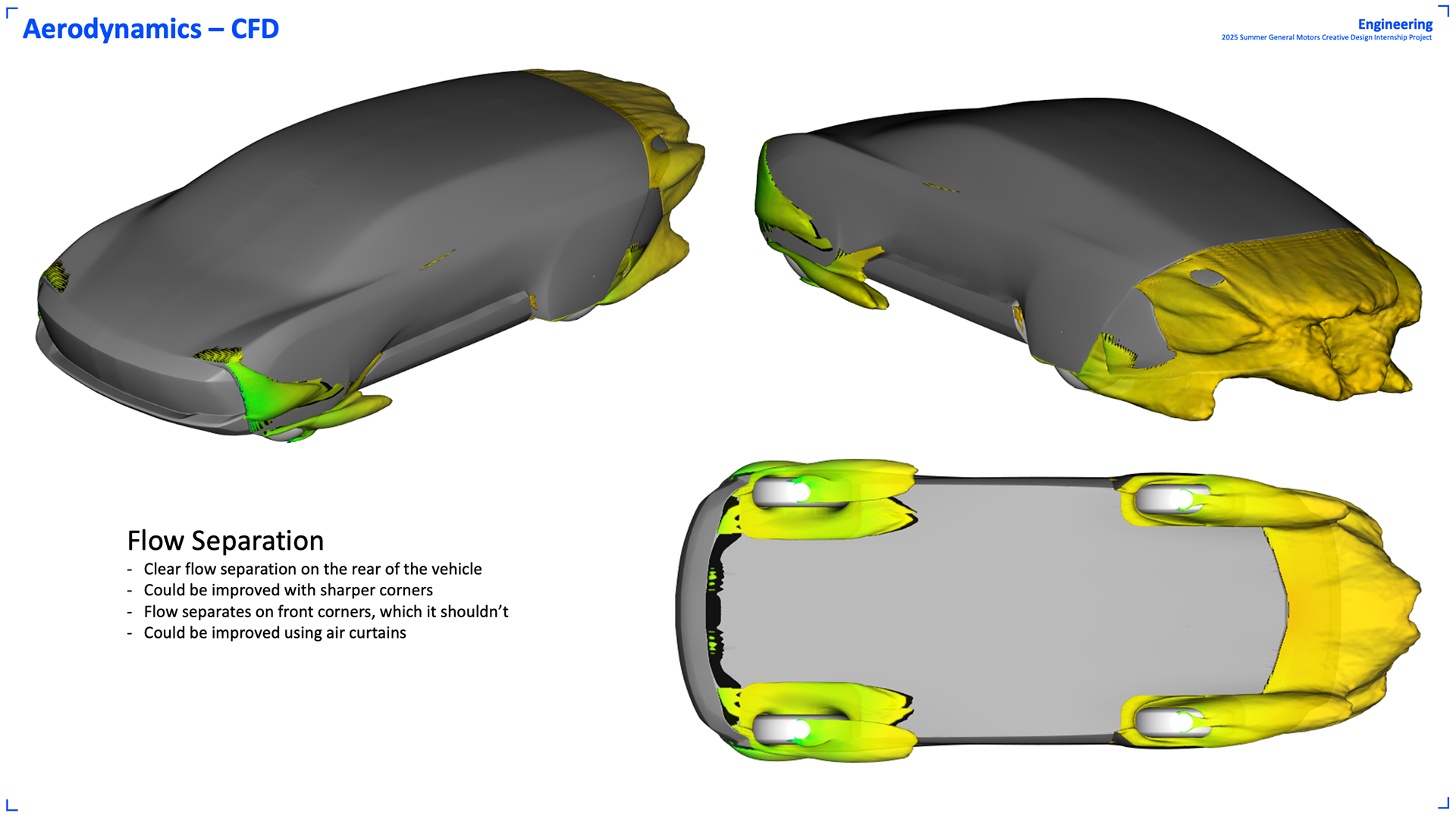 Developed during an internship at General Motors Advanced Design Studio in Pasadena, California, this project explored advanced aerodynamic solutions for a next-generation electric vehicle aimed at Gen Alpha. The scope included Alias CAD development, a 1/3 scale clay model, engineering, fluid dynamics analysis and design for manufacturability.